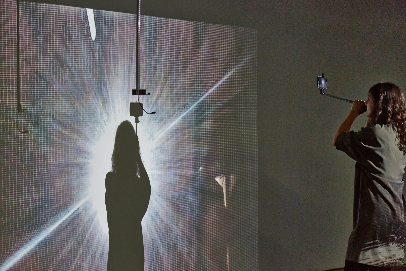In der Performance ergeben sich komplexe Systeme, welche nicht nur auf das Selfie verweisen, sondern auch unterschiedliche Beobachterpositionen einnehmen. So ist Performer_in #1 nicht nur in der Selfie-Pose, sondern beobachet gleichzeitig das auf sie projizierte Selfie. Performer_in #3 filmt das projizierte Bild. Sobald jemand aus dem Publikum ein Foto oder Video macht, wird er/sie dadurch Teil der Szene und Teil der Beobachtung und zum “Beobachter des Beobachters”.
