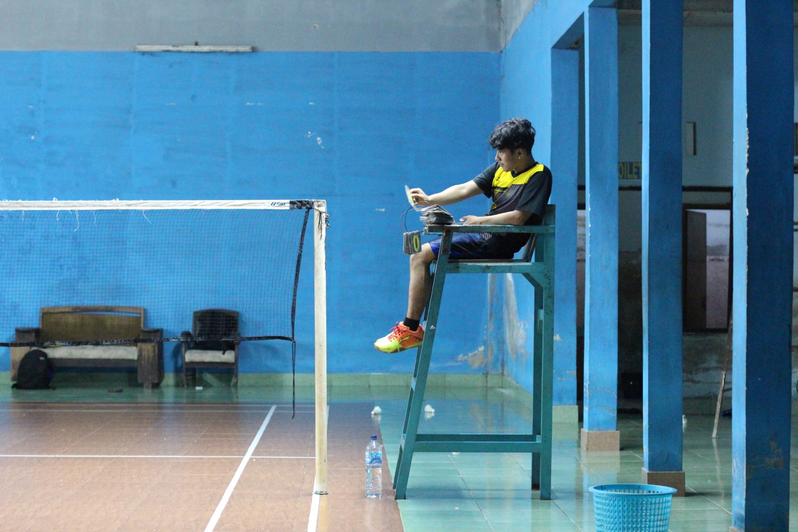 I talked to many different people and did some interviews but mainly I was focusing on the different soundscapes and noises of badminton halls. As it was raining season it was a very specific and very noisy experience. Badminton gymnasiums can be found in any imaginable size in Jogjakarta. I found myself very often standing underneath a roof of white noise, being sure to understand better why there is such a brilliant “Noise Music Scene” in Jogjakarta. Heavy rain was falling onto mainly iron roofs and the acoustic of the gymnasiums quite often changed dramatically. I did many recordings in hypercardioid and cardioid mode from a very close distance standing at corner points of the courts and from a more distant position recording from stands.